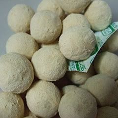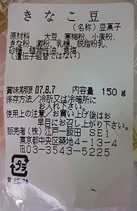 | | my aunt bought this pack of lightly-coated spheres from japan. apparently (if knowledge of hiragana persists) they are called kinako beans as implied by the label on the back of the pack: